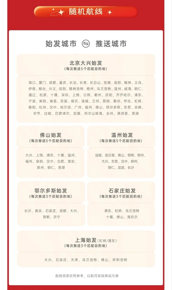 往返含税498元/成人,398元/儿童,含23kg行李托运,出发地自选,目的地随机分配,看到合适的航班可以兑换机票,每套“盲盒飞行家”可兑换往返机票一套。未兑票可以全额退款。