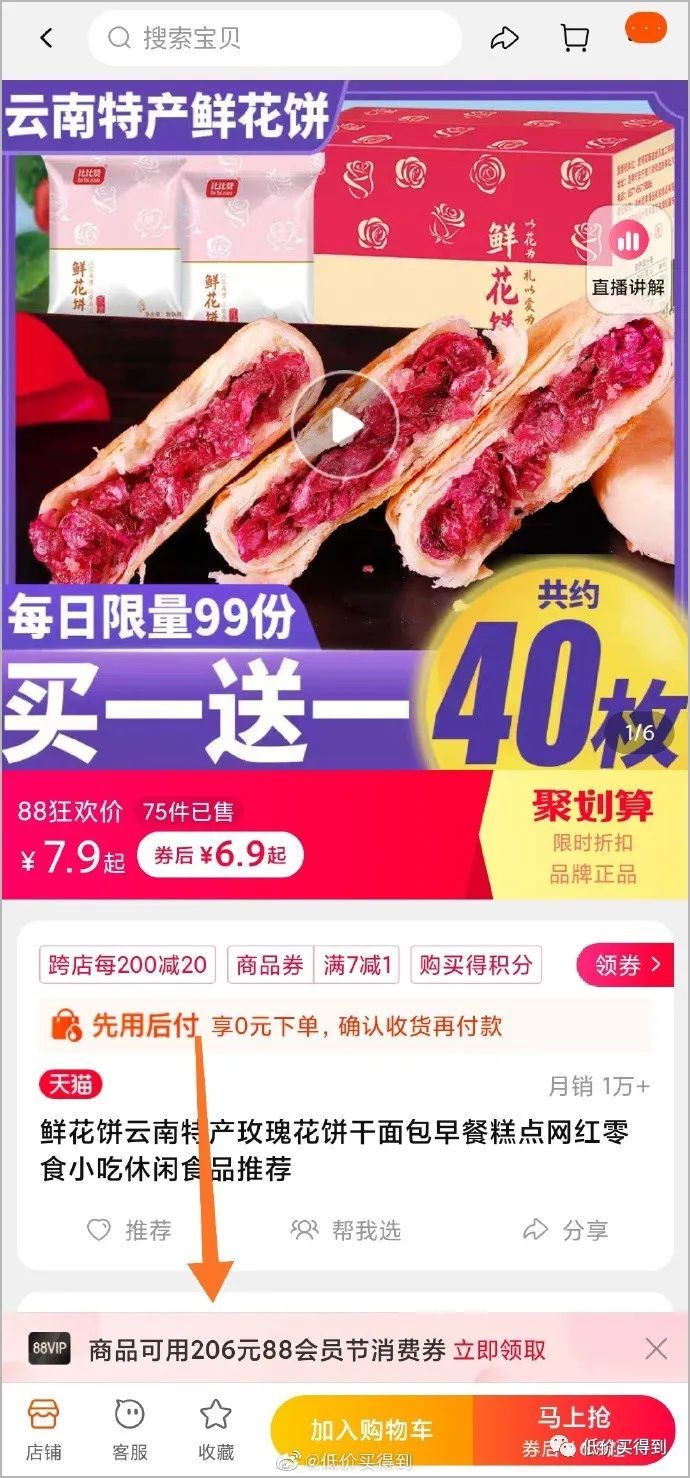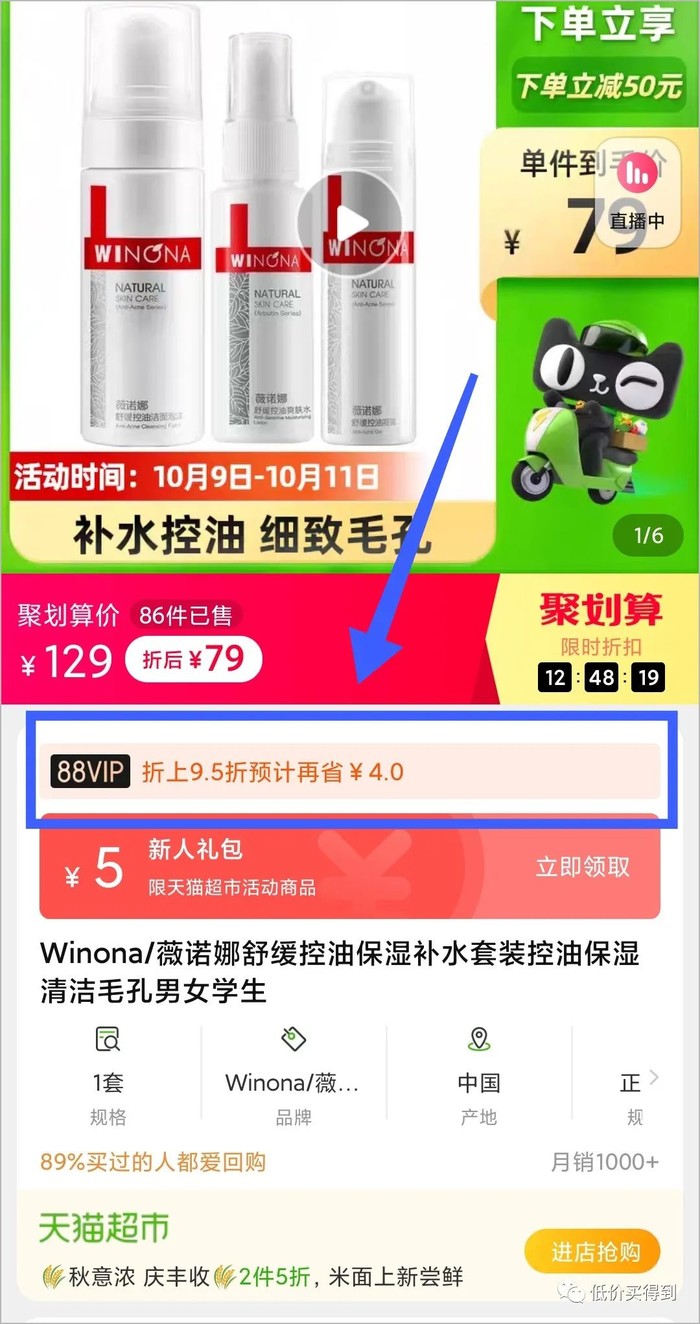 折上9.5折的权益也挺有用的,在商品页面能看到是否享受88VIP折扣。比如这个薇诺娜的套装,折后就能省4元钱,双11要到了,买东西多的话,省钱效果还是很明显。