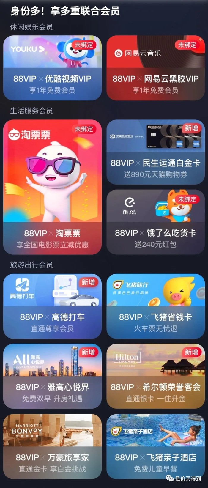 淘宝的88VIP是个好东西,开通之后,能获得优酷VIP年卡、网易云音乐年卡、饿了么超级吃货卡(有240元饿了么红包)、天猫购物折上9.5折、高德打车半年尊享会员、飞猪省钱卡等权益。