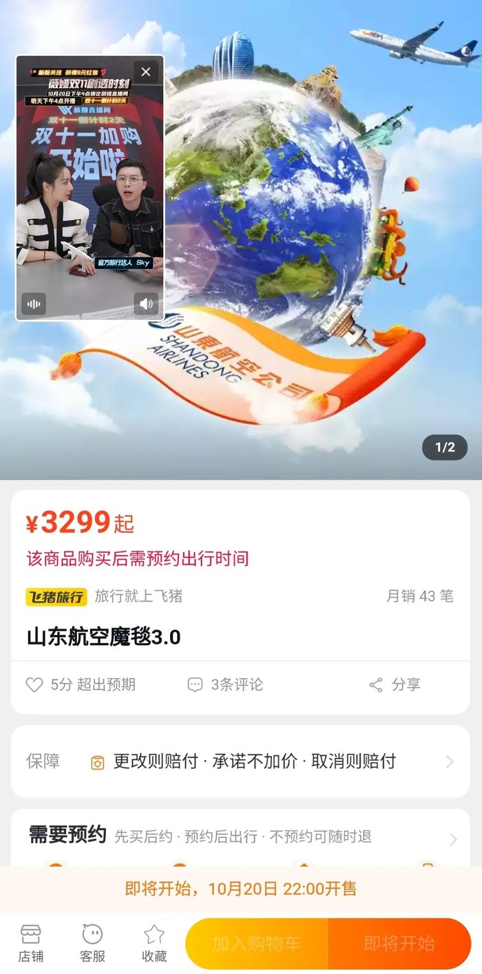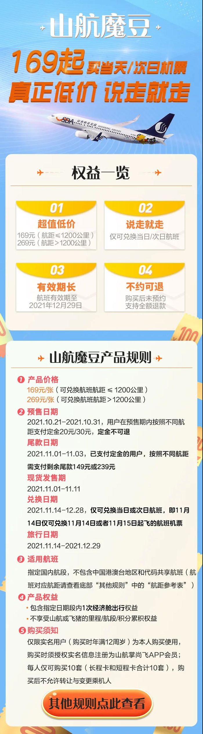 10.21 10:00起,使用飞猪APP搜“山航魔豆”即可预购产品,11.1-11.3付尾款。