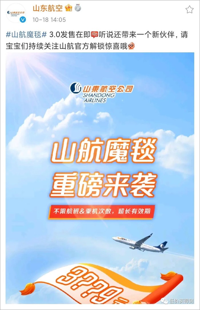10.18,山航微博宣布了山航魔毯3.0(即 山航无限飞3.0)的存在,并且还透露,会带来一个新伙伴——山航魔豆。每个魔豆可兑换1张当天、或次日的航班机票,相当于卖超级尾单了,魔豆的具体规则在文末。