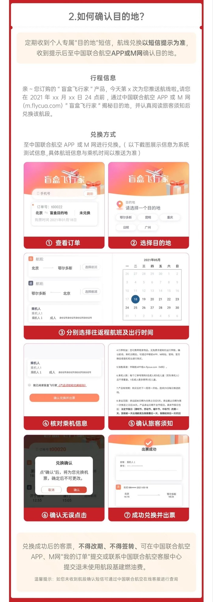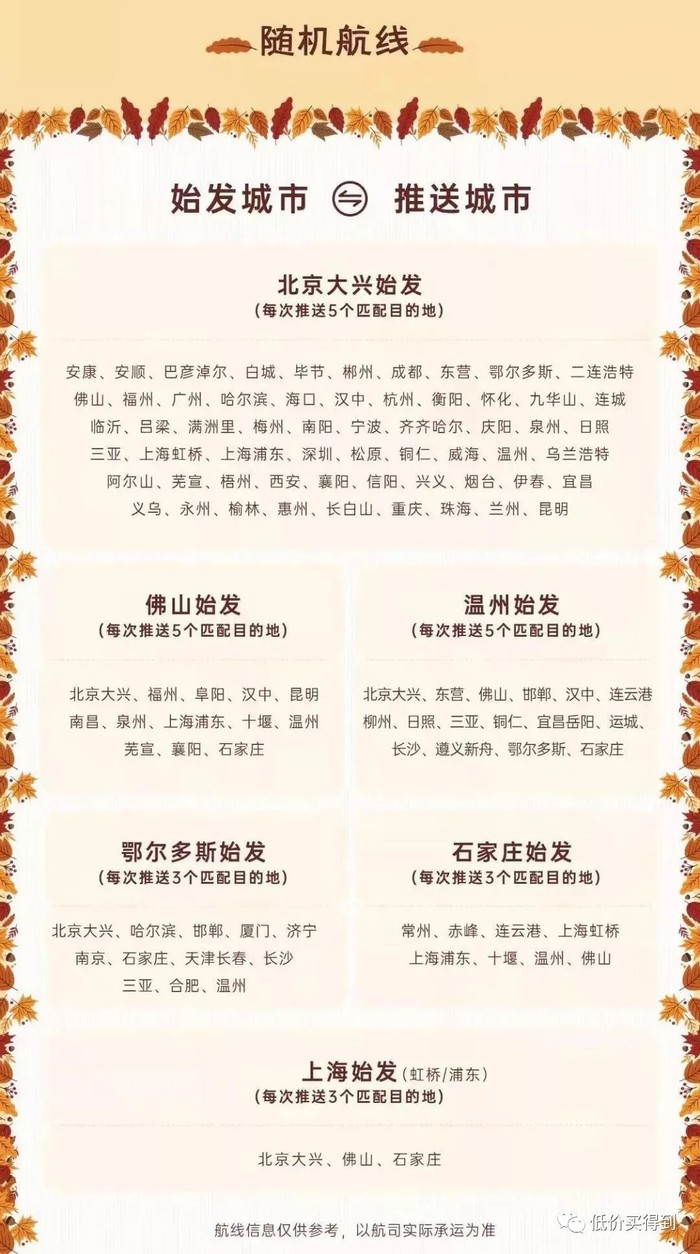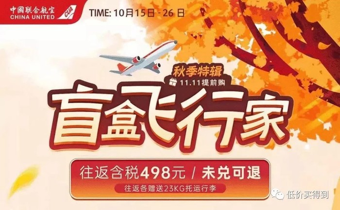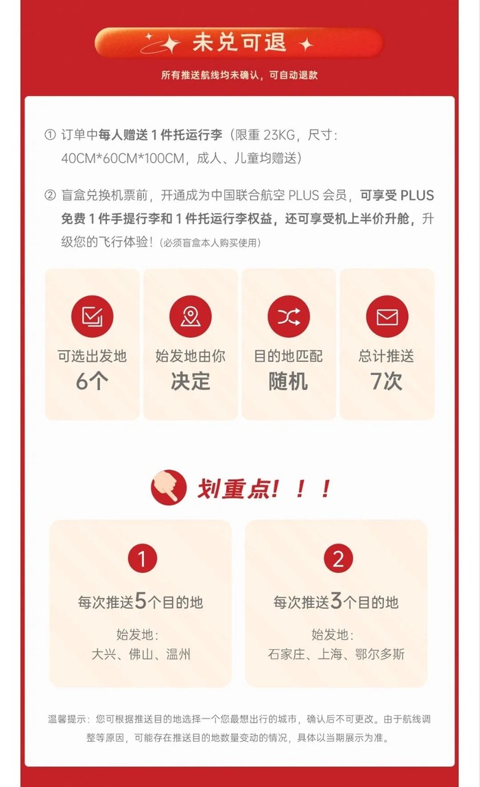 往返含税498元/成人,398元/儿童,含23kg行李托运,出发地自选,目的地随机分配,看到合适的航班可以兑换机票,每套“盲盒飞行家”可兑换往返机票一套。未兑票可以全额退款。