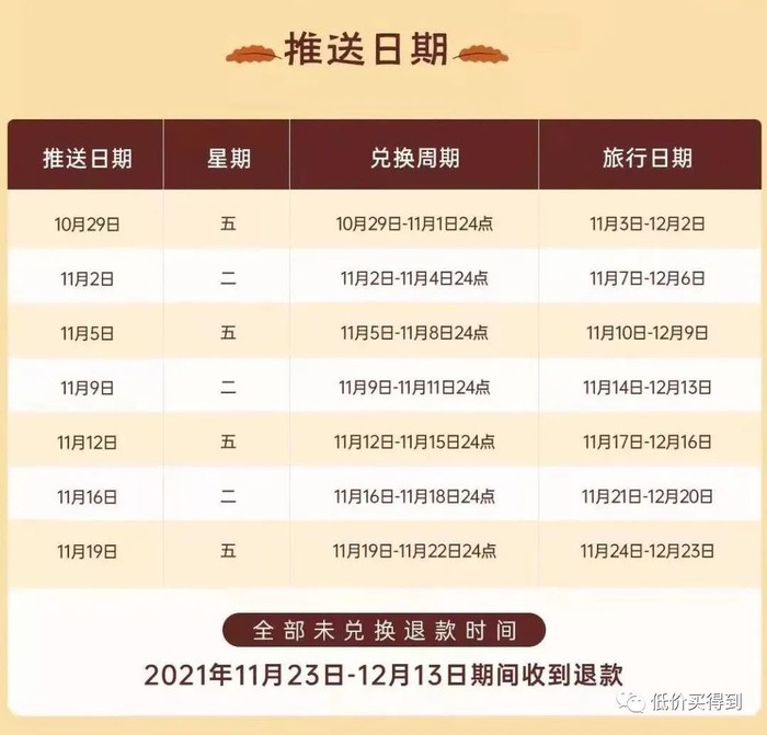 从10.29起,每周五、周二更新目的地,对应可选的旅行日期范围如下: