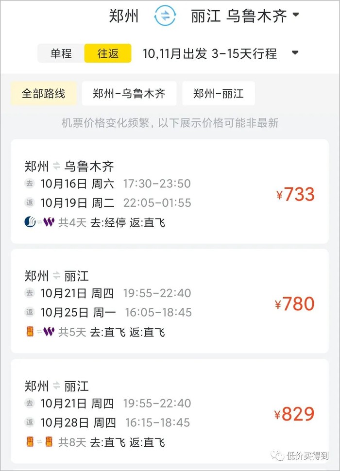 比如郑州往返丽江,10月、11月,目前最低票价都在800元左右,第三方平台价格查询截图: