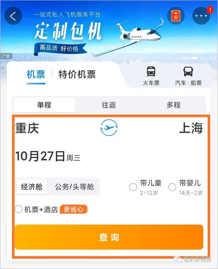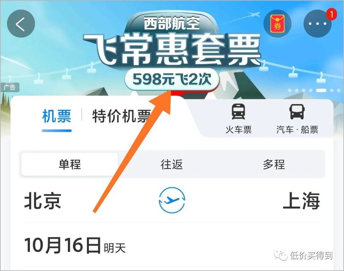 即日起-11.13,在携程APP兑票,直接进入携程APP机票页面,选择出发地、目的地、出行时间,搜索西部航空带有“飞常惠”标签、价格为0元的机票,支付50元税费进行兑换。
