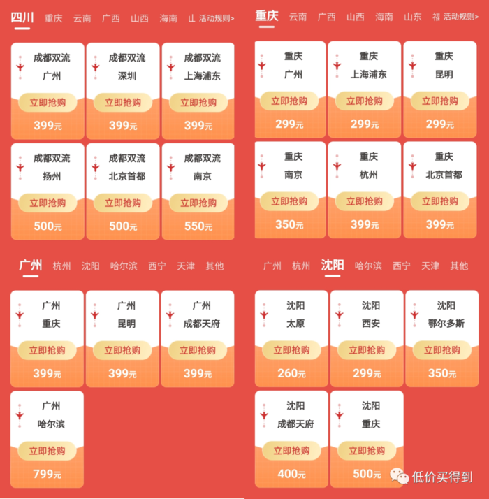 成都/重庆-北上广深,单程票价299~500元。全国其他城市出发的票也有,可前往活动页面查看,大家搜索机票前,记得先登录川航会员。