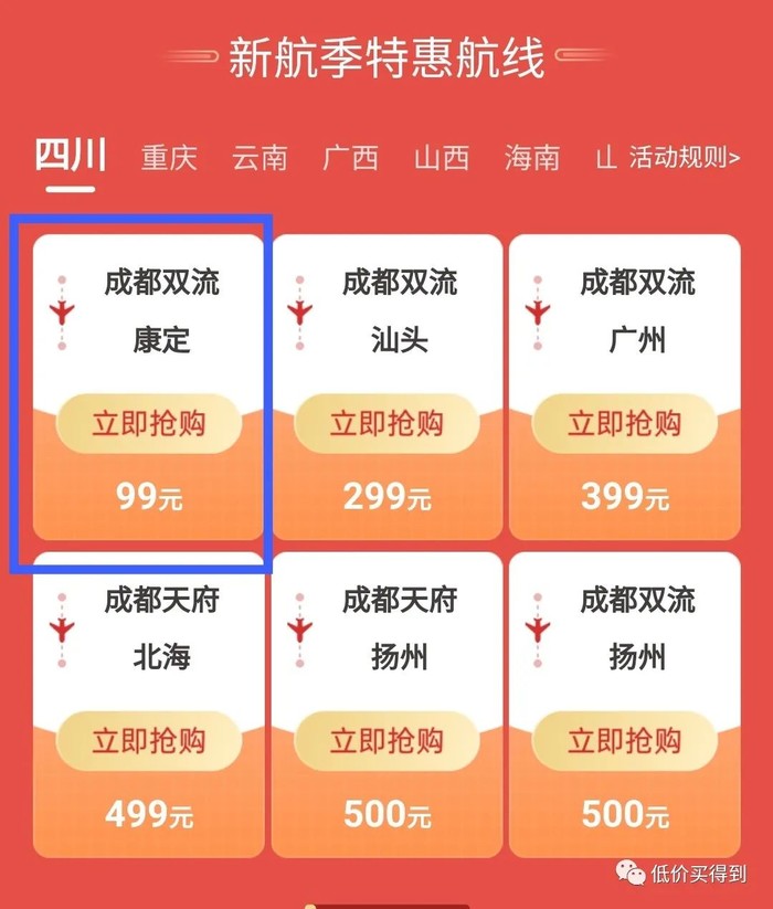 特惠航线价格99元起,但99元是成都-康定这种省内航线。