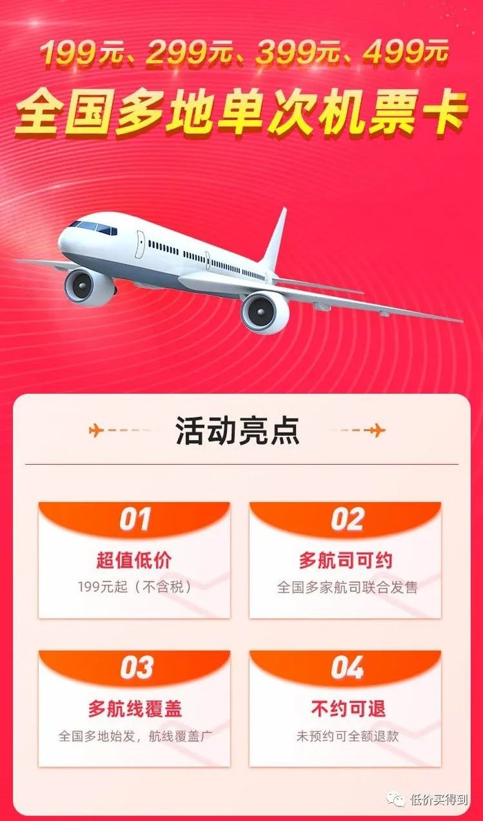 每套次卡可兑换1张单程经济舱机票,机票税费另付,未兑换机票可全额退款。亮点在于支持的航司、航线很多。