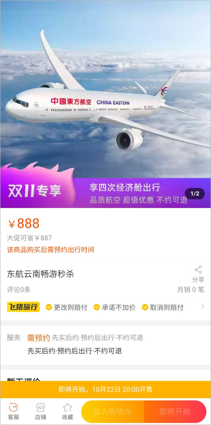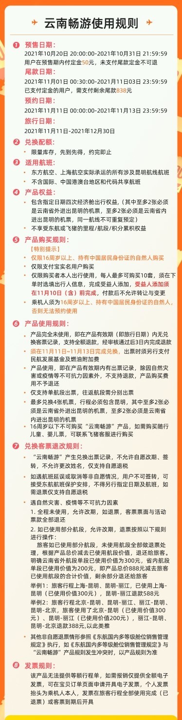 东航云南机票套票,价格888元,包含2次外省进出昆明机票+2次云南省内进出昆明机票。如果从外省经昆明转机,飞云南其他地方,一趟往返,就刚好把这4次乘机权益用完。未预约机票可全额退款。