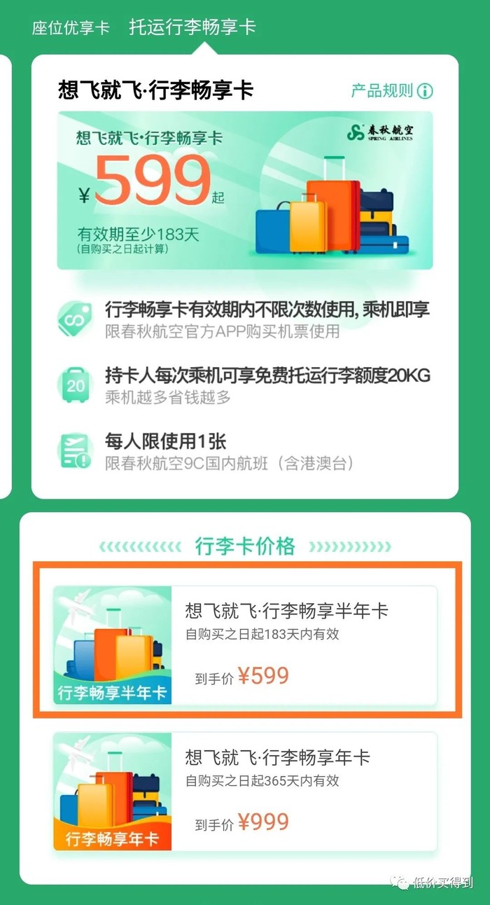 大家如果需要行李托运的话,可以看看春秋航空的行李畅享卡,599元半年卡,购买之日起183天内有效,有效期内每次乘机,有20kg免费行李托运额。
