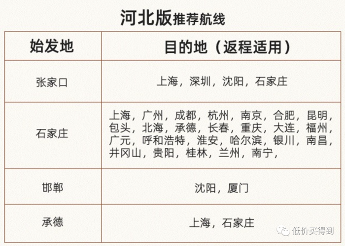 有石家庄、张家口、邯郸等地出发,石家庄航线最多,当地的朋友们可以重点关注。