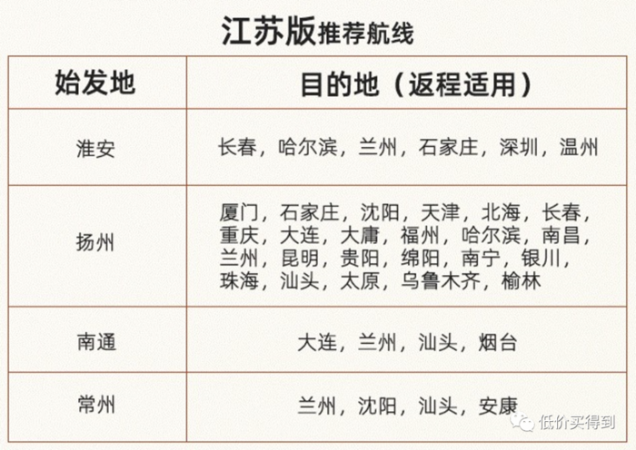 有南京、扬州、淮安、盐城、常州出发。南京只有几条航线,扬州航线会多一些。