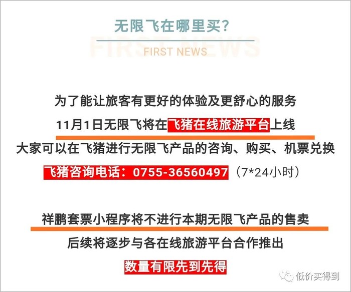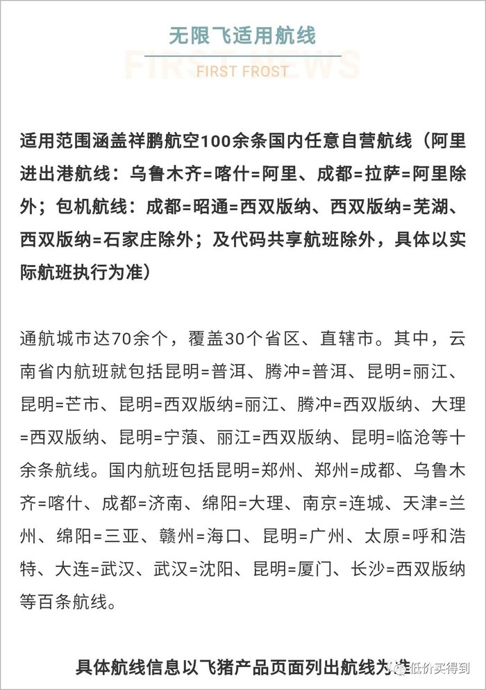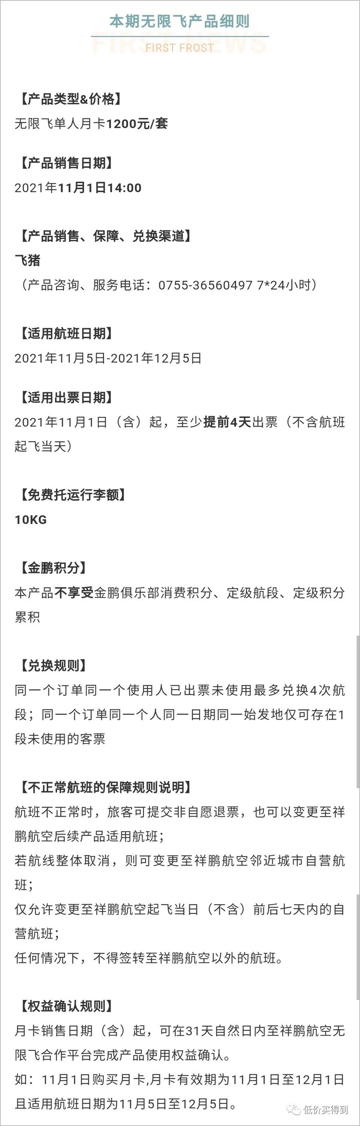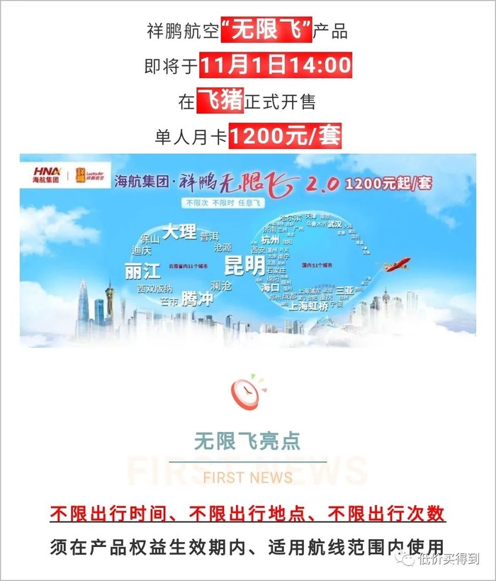 祥鹏航空公布了无限飞2.0的详细信息,1200元/套,11.1 14点在飞猪平台销售(不是在祥鹏套票小程序,这点要注意),有10kg行李托运,最多可兑换4个航段待使用。