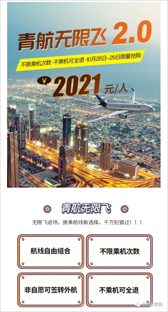 青岛航空无限飞2.0,价格2021元/套,每套由1位乘机人使用,购买之后,可在有效期内,不限次数乘坐青岛航空实际承运的部分国内自营航线(参考航线见后文),未实际乘机(且无违规情形)可全额退款。申请退款要在(明年)2022.10.30之前。