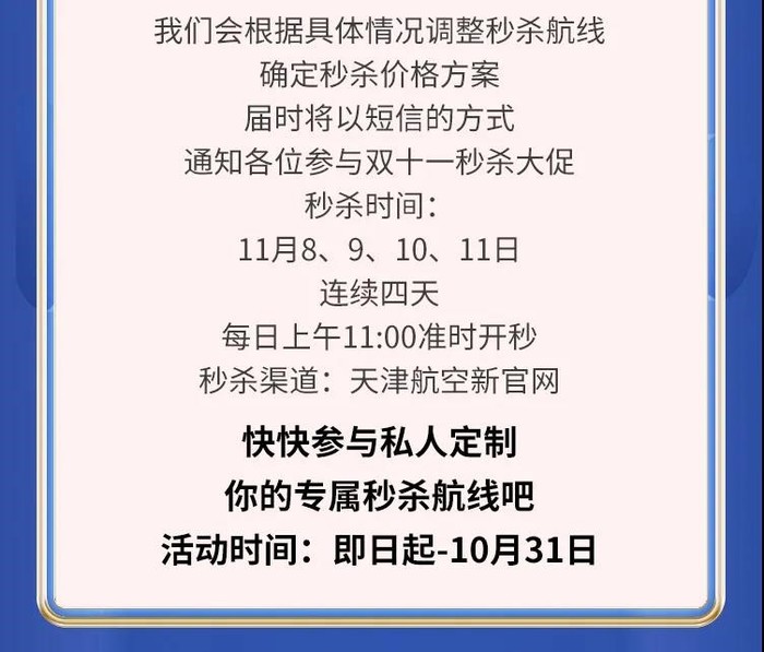 天津航空机票秒杀,11.8~11.11,连续4天秒杀。
