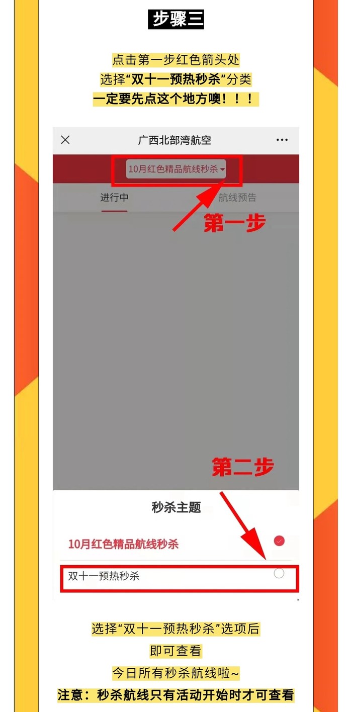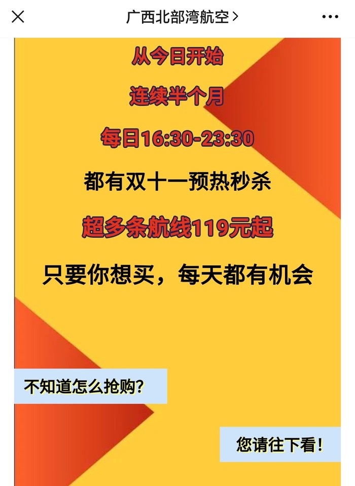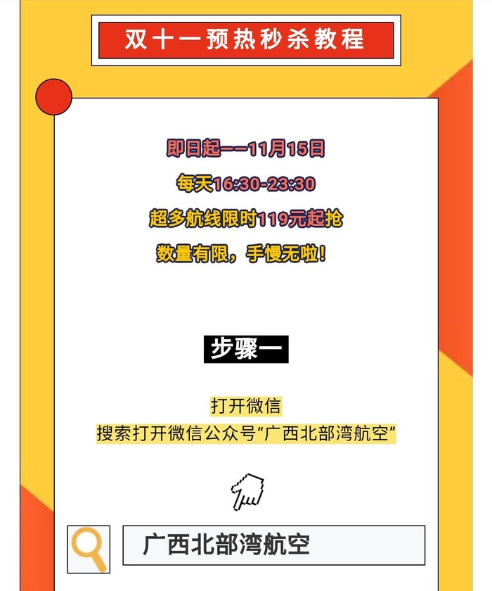 即日起到11.15,每天16:30-23:30,机票秒杀119元起,秒杀步骤见后文。