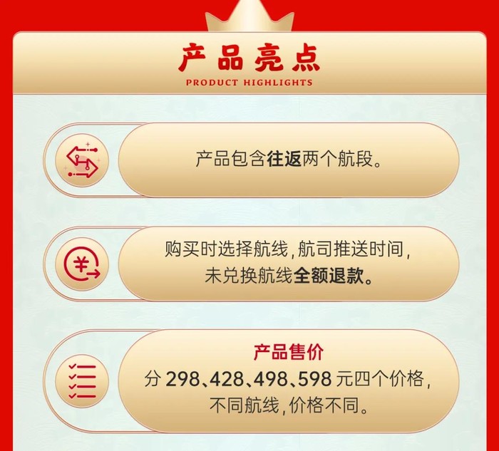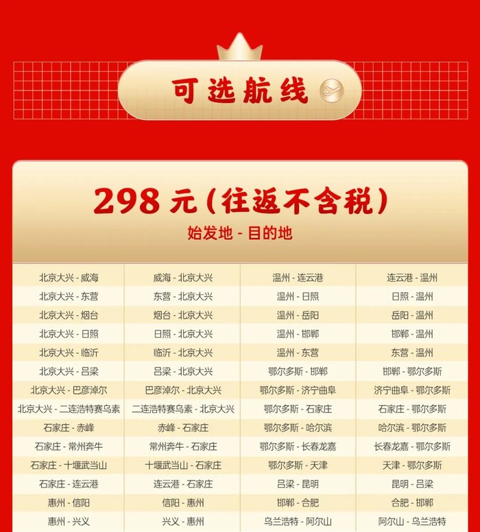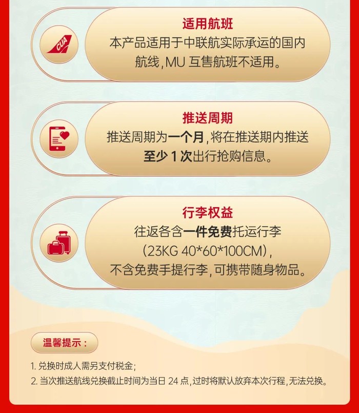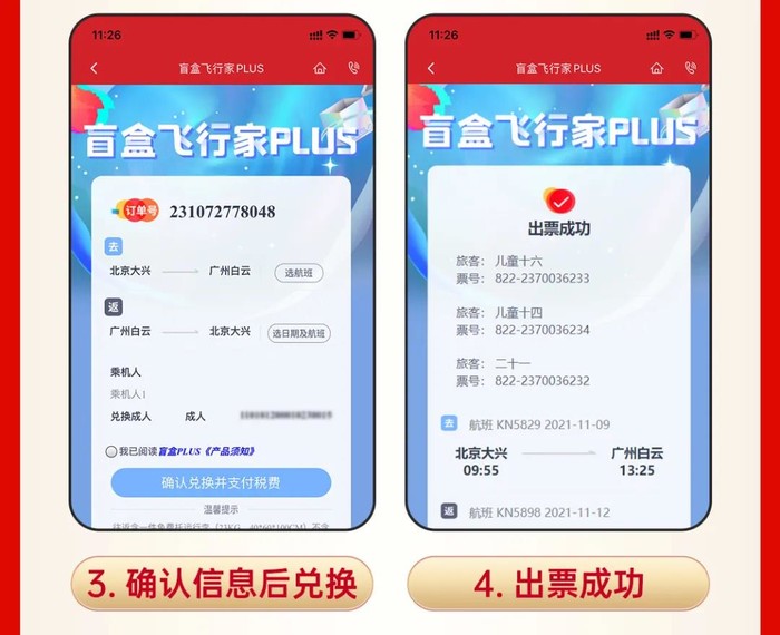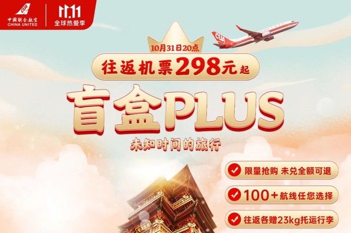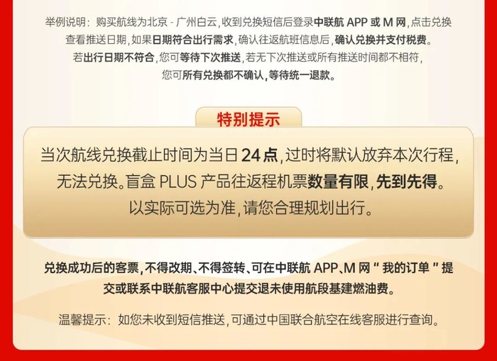 中联航盲盒plus,可兑换往返机票一套。购买时任选航线,出行时间随机分配。