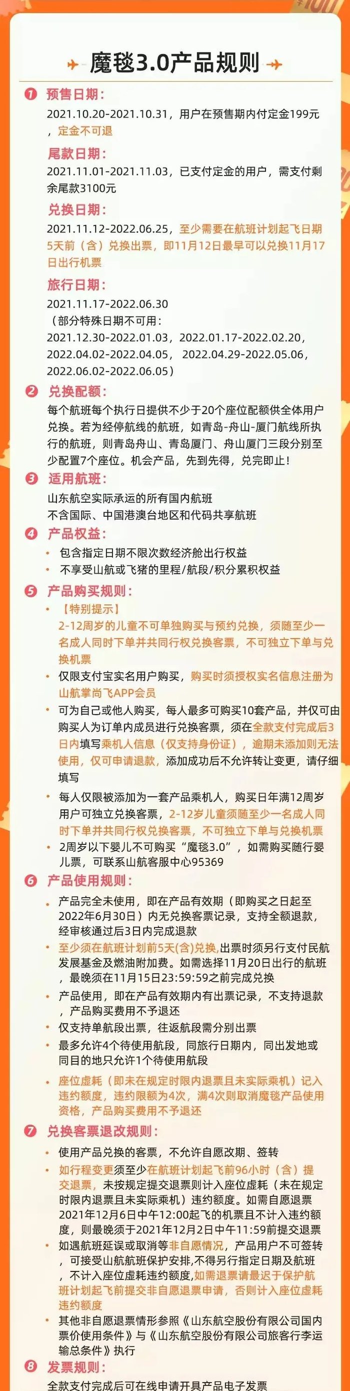 购买后,可在有效期内,不限次数乘坐山航国内实际承运航班经济舱(不含港澳台地区航班,不含共享航班)。乘机日期到明年6月底。每套魔毯3.0由1名乘机人使用。山航有免费的行李托运额。