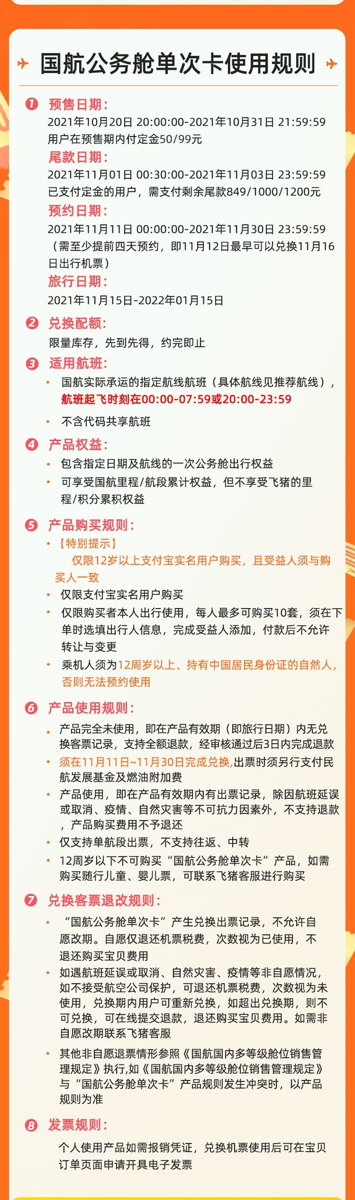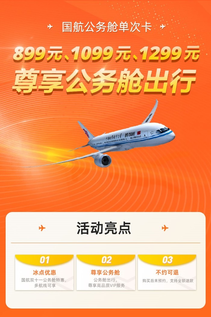 国航公务舱单次卡,根据航线不同,价格分为899元、1099元、1299元,每张次卡可兑换1张国航指定航线范围公务舱机票,航班时间在早8点前,或晚8点后,不支持转机,税费另付。