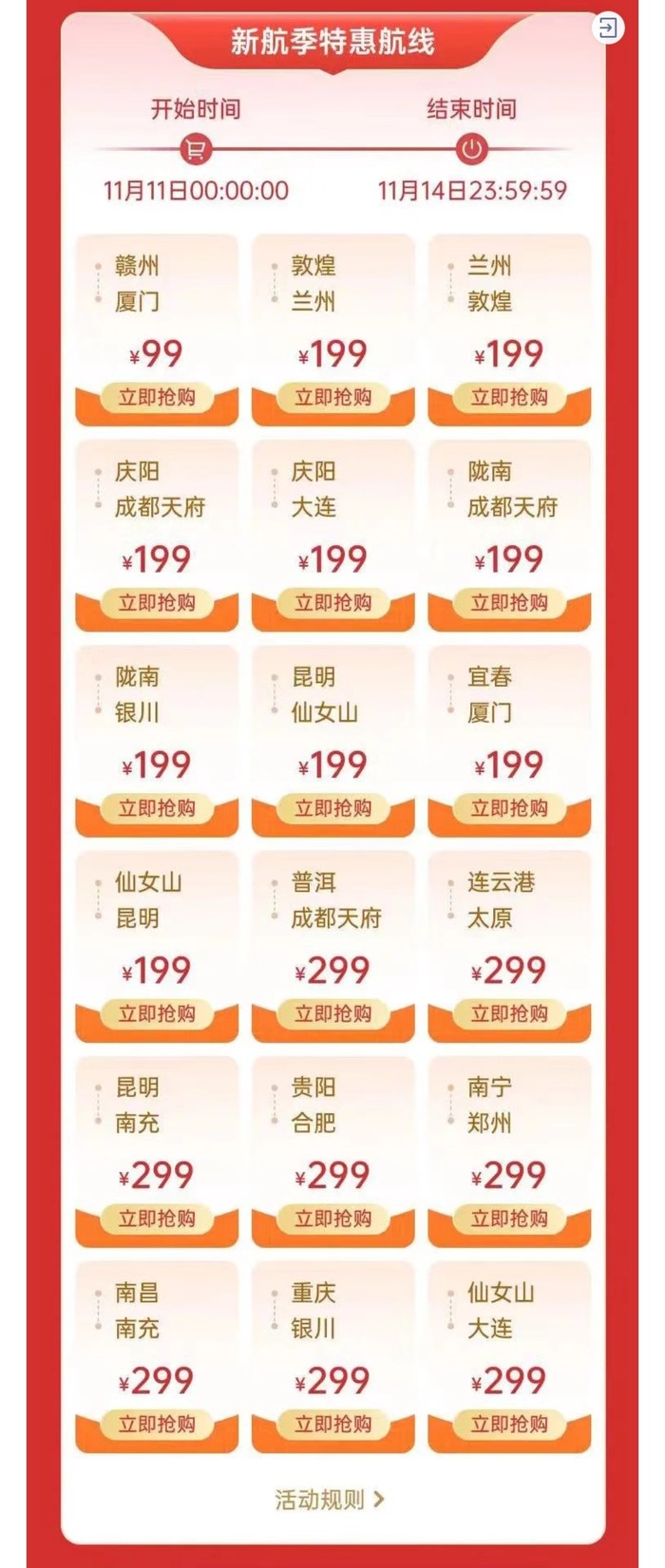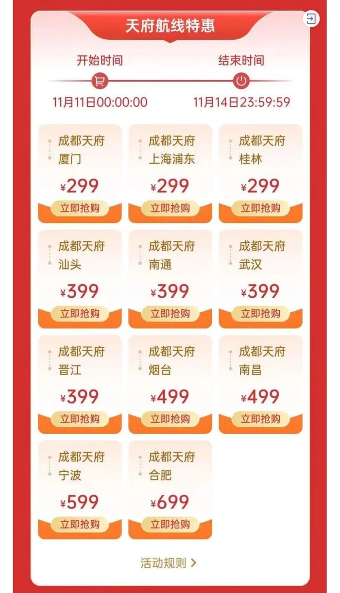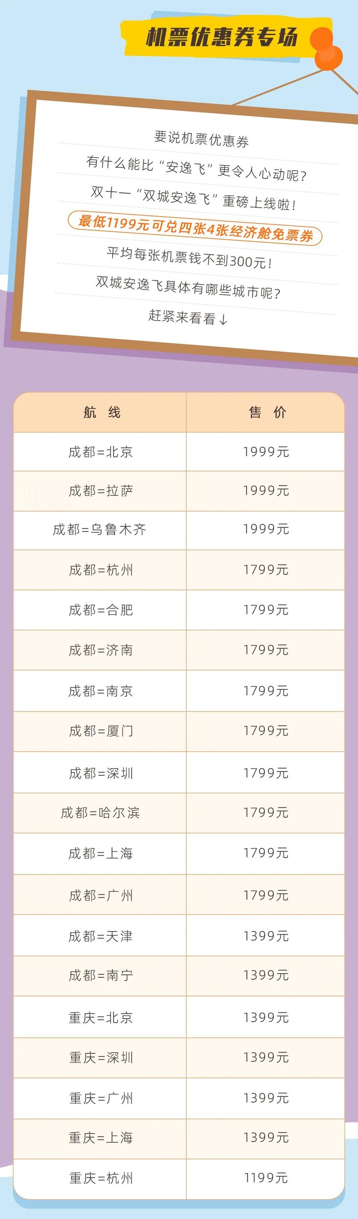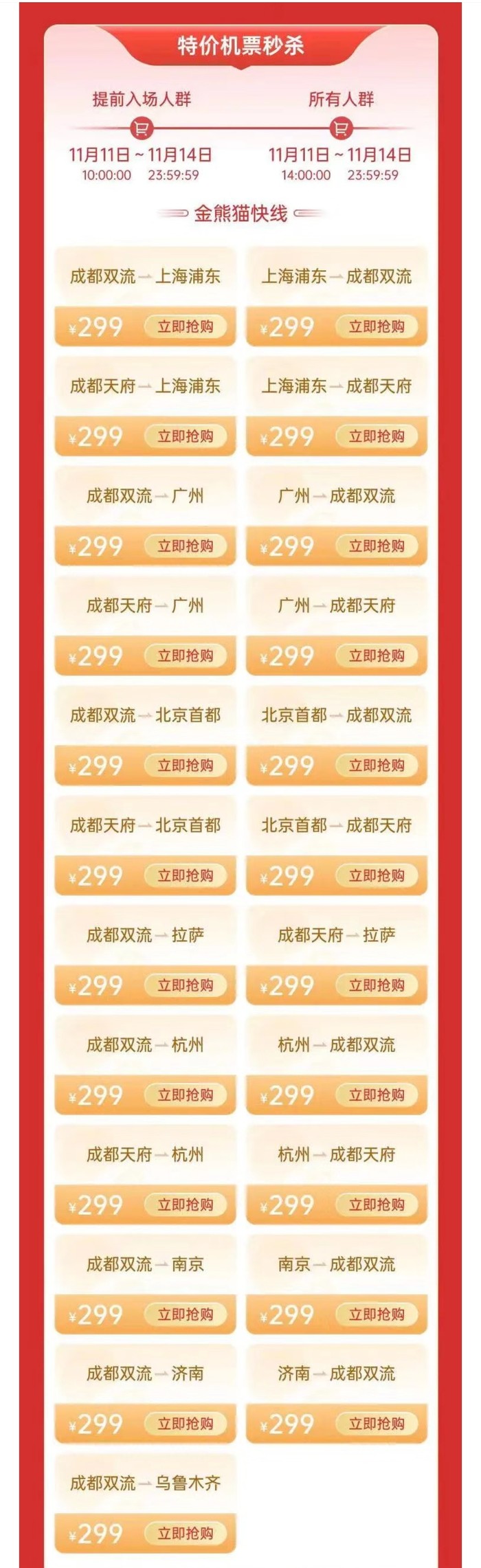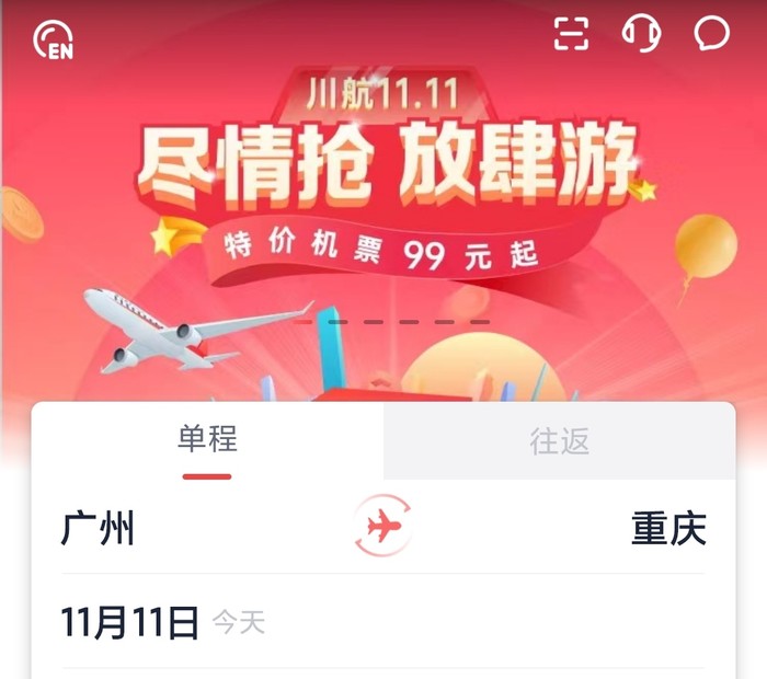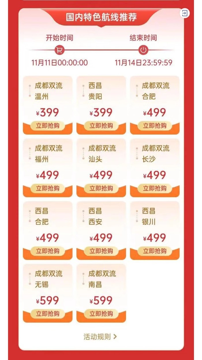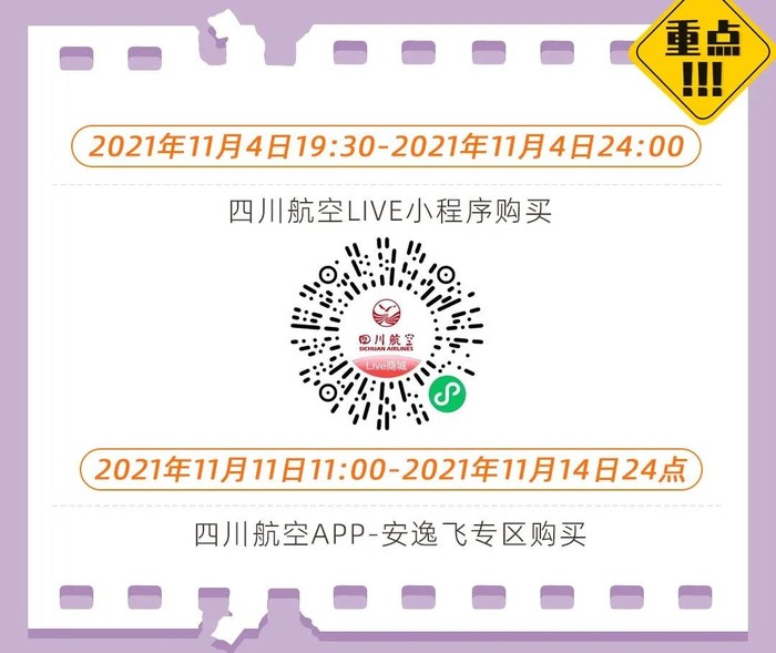 11.11 11点~11.14 24点,在川航APP-安逸飞专区销售。