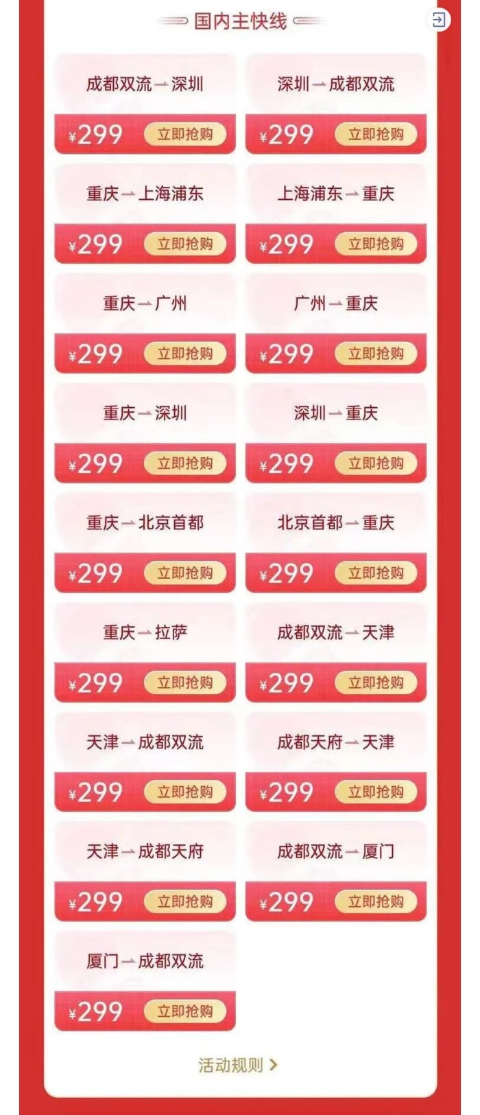 川航双城飞机票套票,价格1199元~1999元,根据所选航线不同而变化。