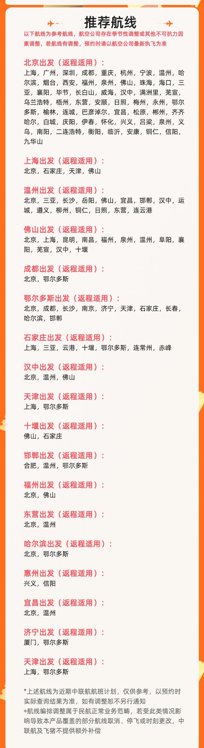 佛山、温州、鄂尔多斯出发,有10~20条航线。广州的朋友,要不要考虑从佛山出发呢?