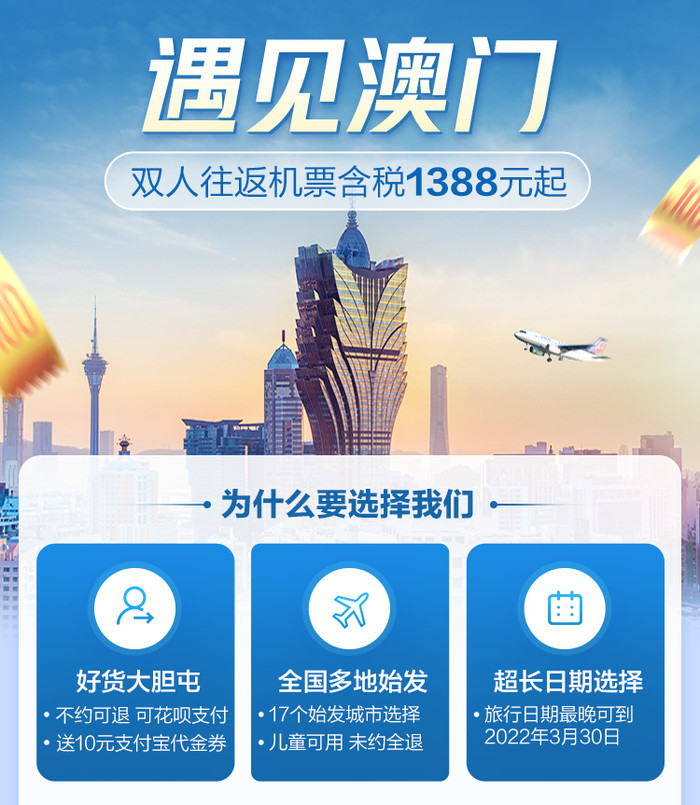 双人往返澳门,含税1388元起,