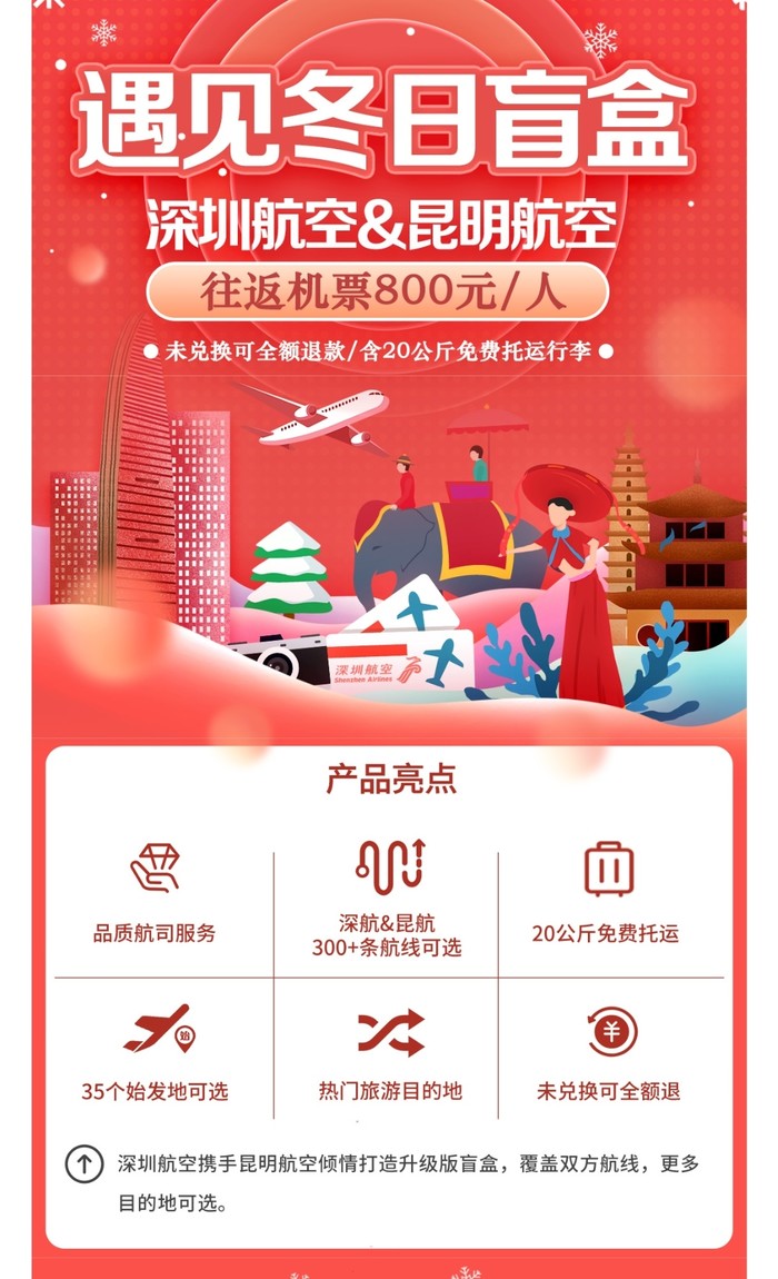 深圳航空+昆明航空机票盲盒,往返800元/人,不含税费(往返税费120元~140元),含20kg行李托运。若为兑换机票,要在2022.1.9之内申请退票。