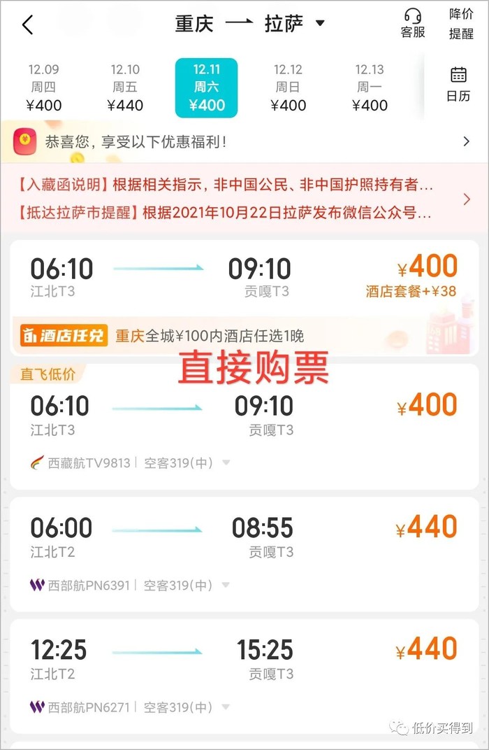如果想买重庆往返拉萨的话,此前西藏航空“藏易行”更划算:399元,含 1张进藏单程机票+1张399出藏航线无门槛直减券+100元车接优惠券。