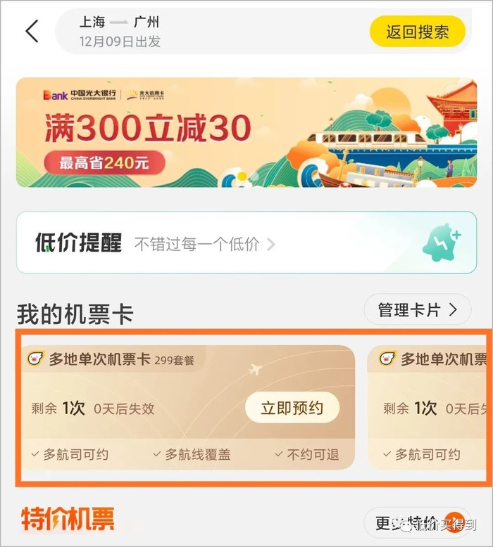 同航线同日期,如果直接购票的话,票价400元起,用单次卡兑票至少便宜100元。