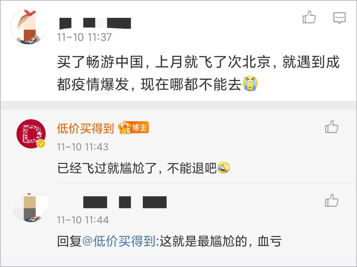还有比较惨的,是买了南航畅游中国(无限飞)的朋友,因为南航推出比较早,可能有些人已经使用过,但是后来疫情加剧,不能出行,结果没飞几次,又不能全额退款,简直血亏。