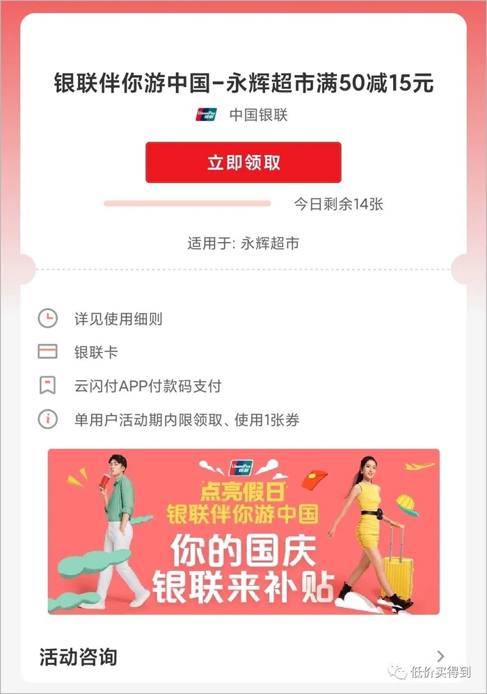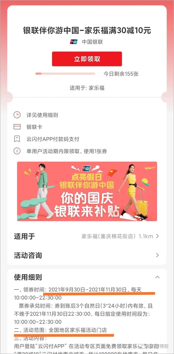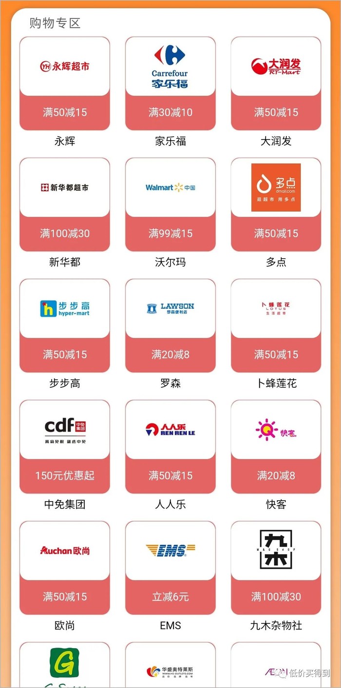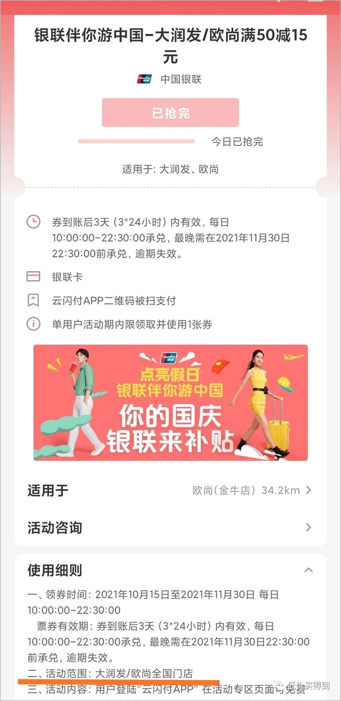 比如永辉 满50-15,写的全国指定门店可用,但基本大一点的永辉超市都可以用。