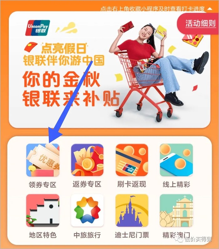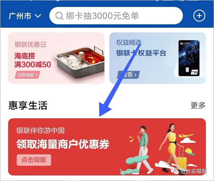 打开云闪付APP,滑动到“领取海量商户优惠券”,点击进入活动页面。