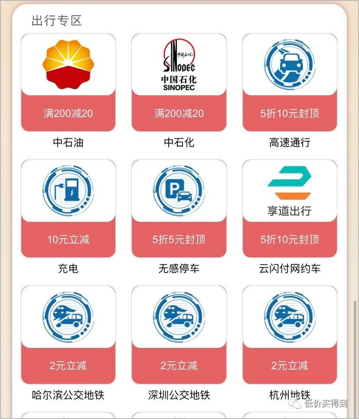 出行专区,有加油、高速通行、乘公交地铁等优惠。
