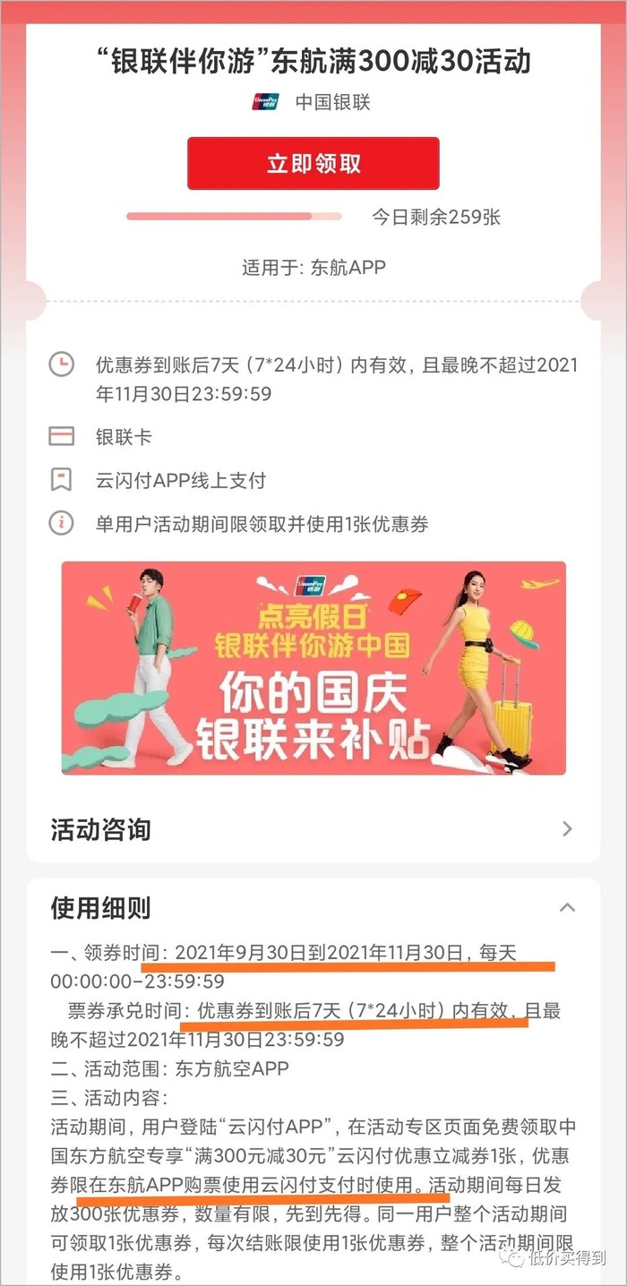 大家熟悉的东航,在文旅专区里有个满300-30的券可以领,在东航APP购票,选择云闪付APP支付可用。