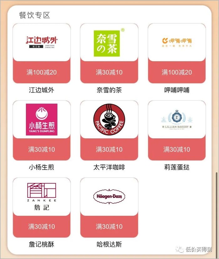 除了购物专区,还有餐饮专区,有奈雪、小杨生煎、太平洋咖啡等店的券。