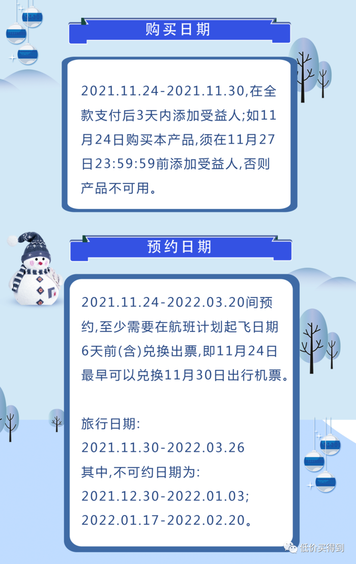 出行时间:2021.11.30~2022.3.26,不适用日期:2021.12.30~2022.1.3(元旦)、2022.1.17~2.20(寒假春节)。