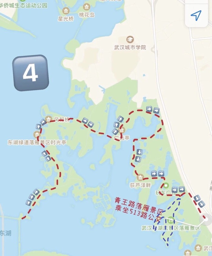 路线:梨园地铁站—【楚风园】—【沙滩景区】—落雁景区【时光亭】—【风和桥】—【伫远亭】—【狄芦泽畔】—青王路落雁景区乘坐513路公交—珞喻路光谷广场站下车到达光谷广场.