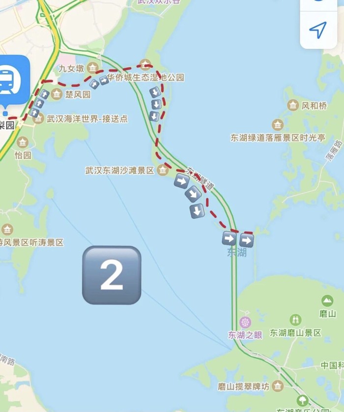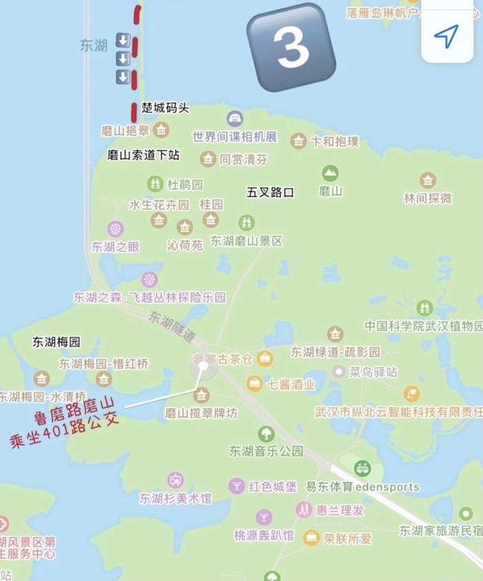 路线:梨园地铁站—【楚风园】—【沙滩景区】—【磨山景区】—鲁磨路磨山乘坐401路公交—鲁磨路光谷广场站下车到达【光谷广场】