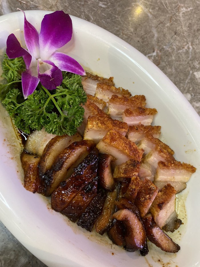 4叉烧双拼:一个是考的焦口感然后包裹着汁另一个是普通做法吧,我也有点忘了但是好吃就完了,这个是沾白砂糖吃