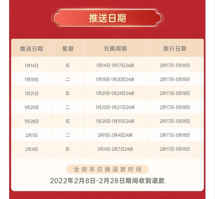 1.14~2.4,每周五、周二更新(推送)目的地,每次更新的目的地,对应的兑换周期、旅行日期如下: