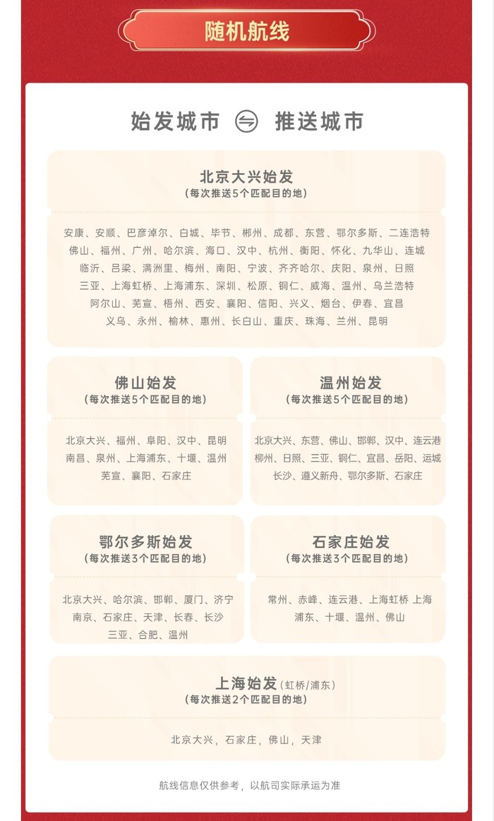 可选北京、佛山、温州、鄂尔多斯、石家庄、上海出发,可能随机更新的航线如下: