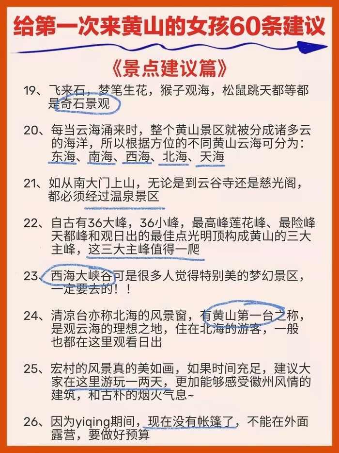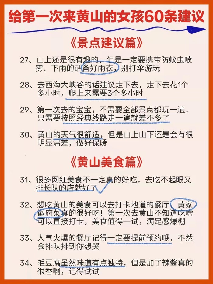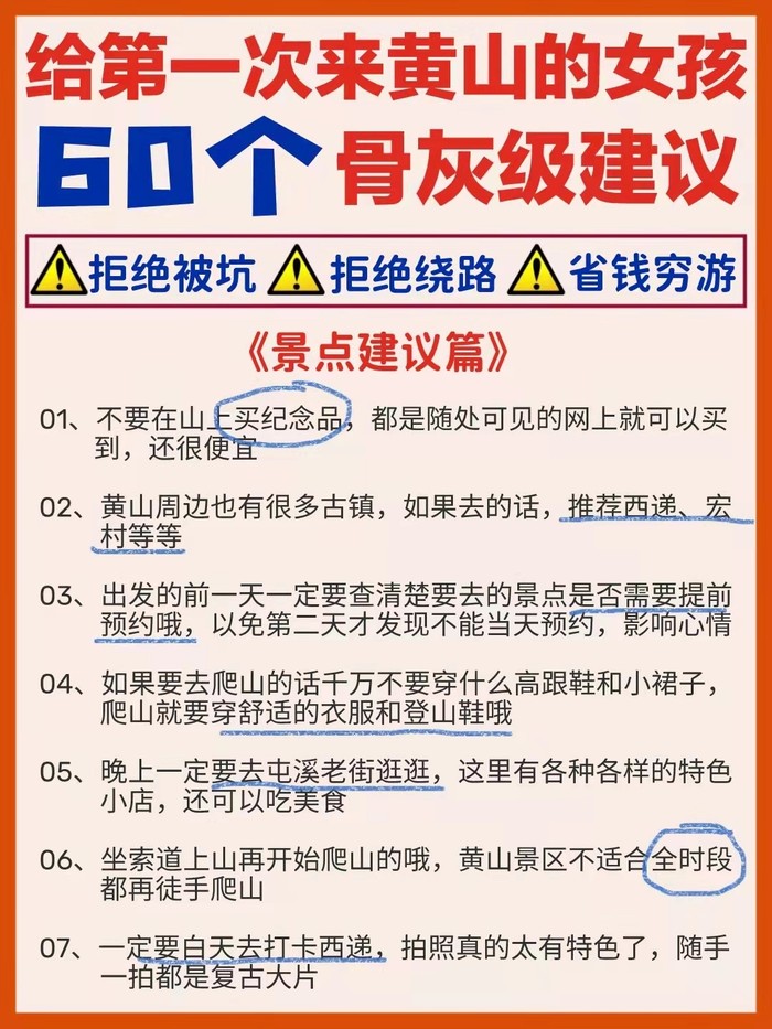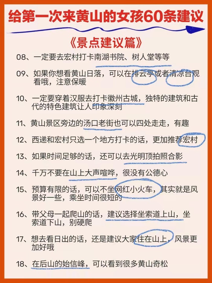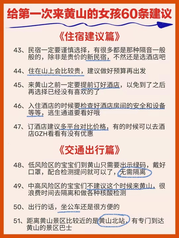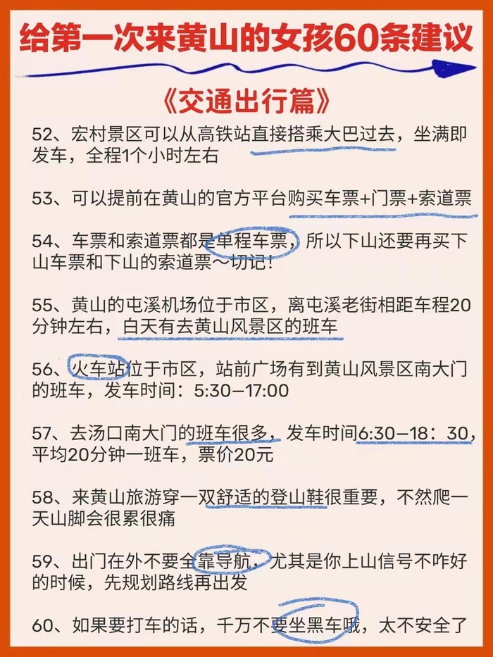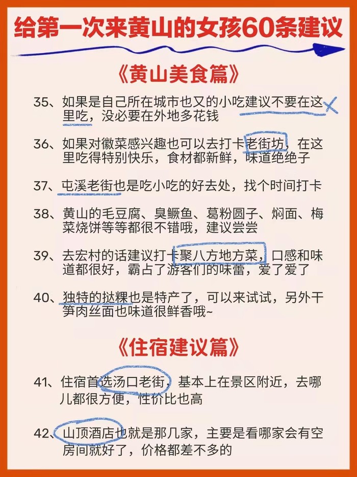 这篇攻略专门写给第一次来黄山旅游的宝宝们~花了一整天的时间总结了60条超良心的建议,一篇就能搞定你首刷黄山的疑虑,建议码住,以防丢失-为了方便大家仔细看,我已经分好类写在图片中啦,主要由以下6️⃣个方面整理:【景点建议】【美食安利】【住宿建议】【交通出行】-
