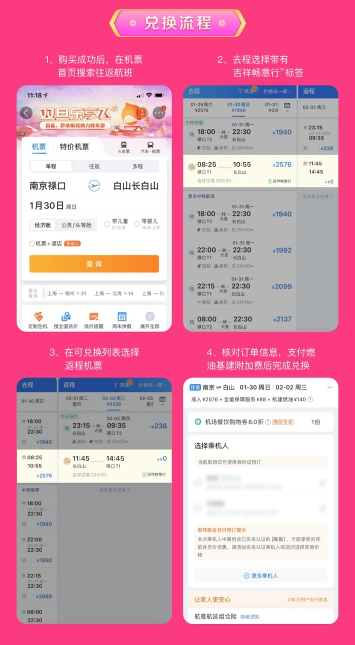 南京出发,往返机票次卡