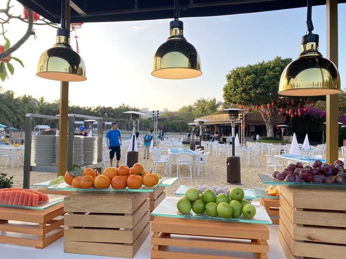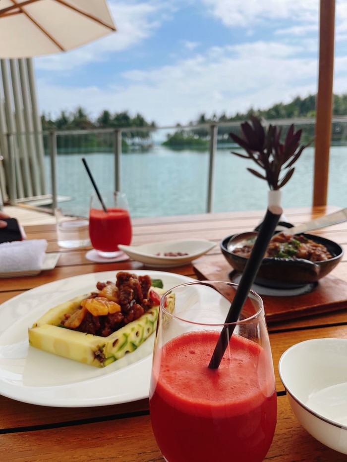 可以在大堂坐接驳车到鲜海粤餐厅,可以提前预约室外的位置或者室内,我们选择了室外的,工作人员还会调整遮阳伞的角度让我们晒不到,并且送上了两杯西瓜汁,服务态度真是yyds,让我对艾迪逊的服务非常满意,下次来三亚一定要来住一晚。吃饭的时候,旁边的一桌还遇到了国内一个男演员一家人来吃饭,果然艾迪逊是传说中偶遇明星机率很高的酒店。