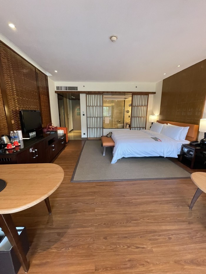 酒店本身设计是有些东南亚风格,有一星是给到服务人员,无论从前台还是帮拿行李的工作人员,都非常的主动热情,行李送到房间以后还给做了各种介绍。帮忙办理入住的工作人员主动加了微信,并发了一些自己整理的游玩小攻略,也是海南我住过酒店里面跟进的天花板了。有什么事情可以直接微信沟通。