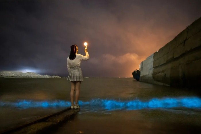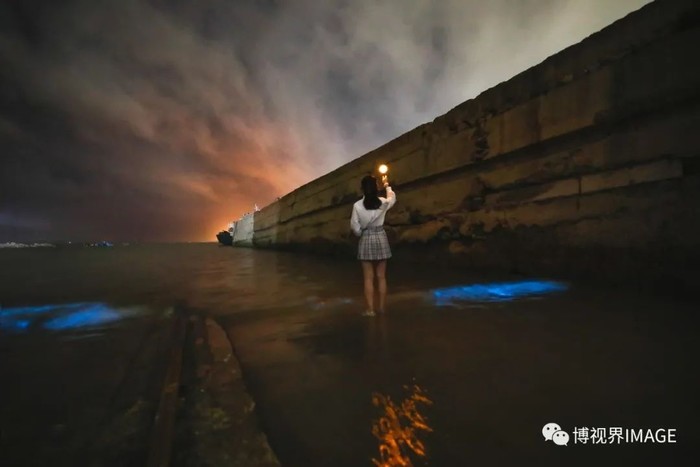 ③往水中丢入石块,会荡出一圈莹蓝色的光圈。