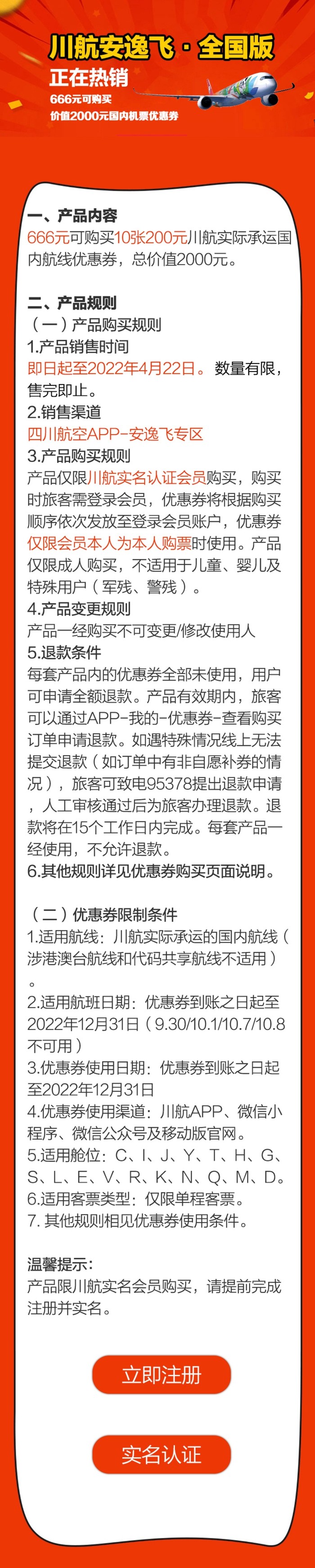 购买平台:川航APP,销售时间 即日起~4.22,或售完即止。