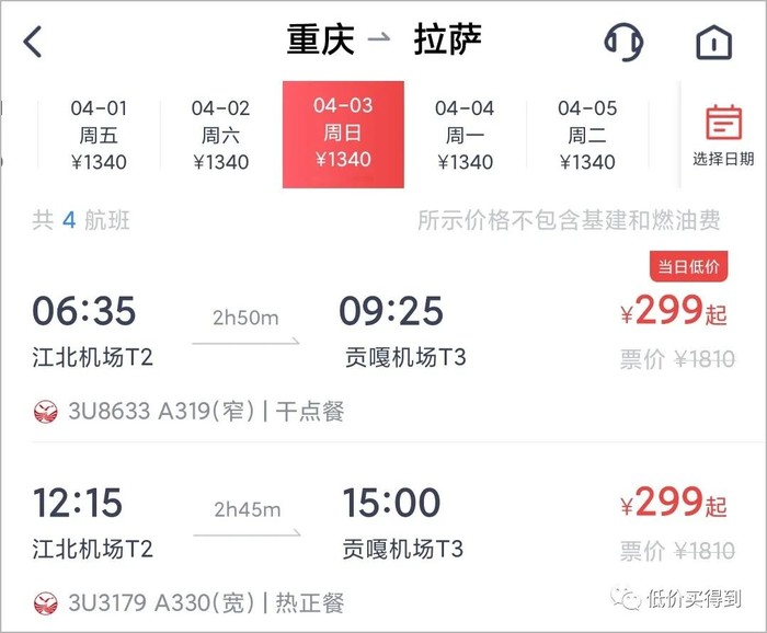 重庆飞拉萨单程,清明节票,票价299元,预计用全国版安逸飞后,票价仅99元。