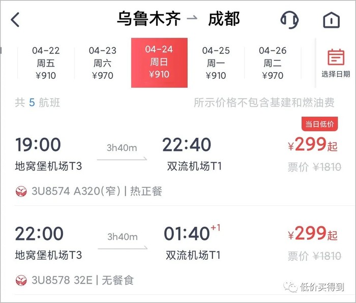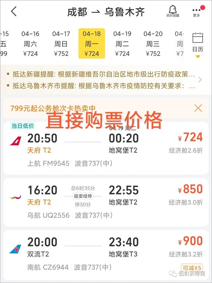 如果直接购票,同一天成都飞乌鲁木齐,票价724元起(含税800多元起),相比之下,川航的特价票便宜非常多!这波给川航疯狂打call!!!